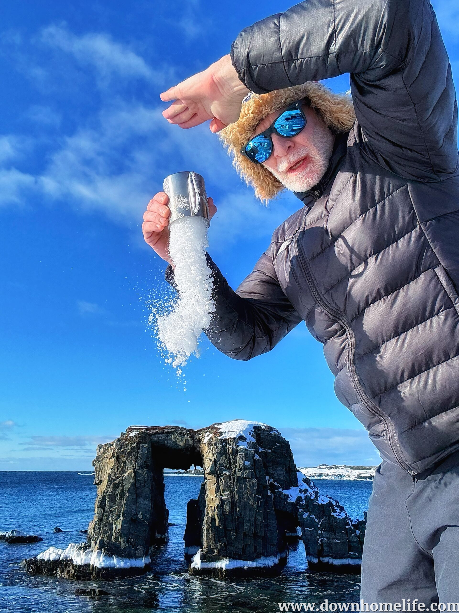 A sprinkle of snow on Arch Rock on the coastline of Little Catalina.