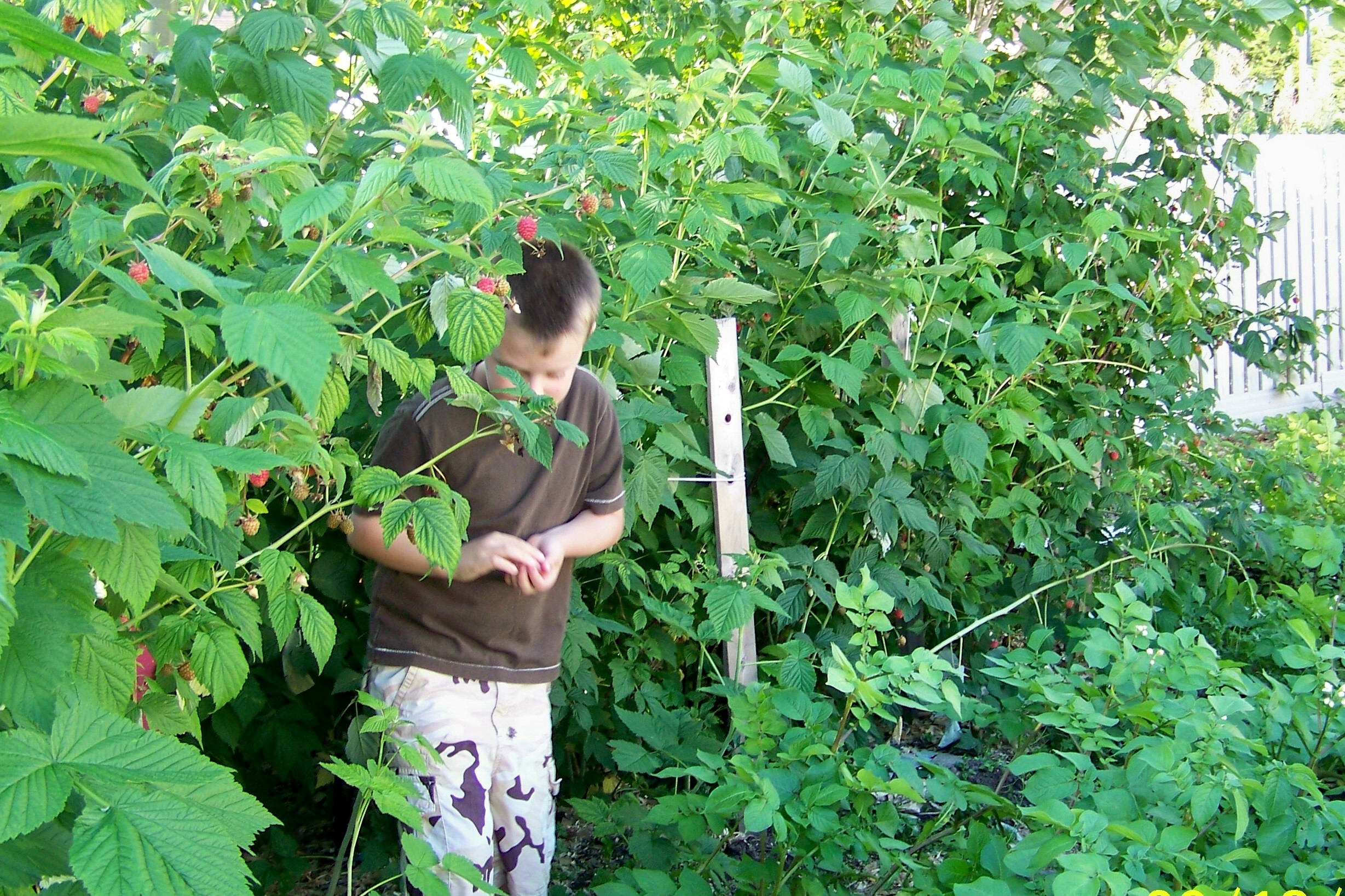 My Grandson Isaac Picking Raspberries in my Backyard in Gander