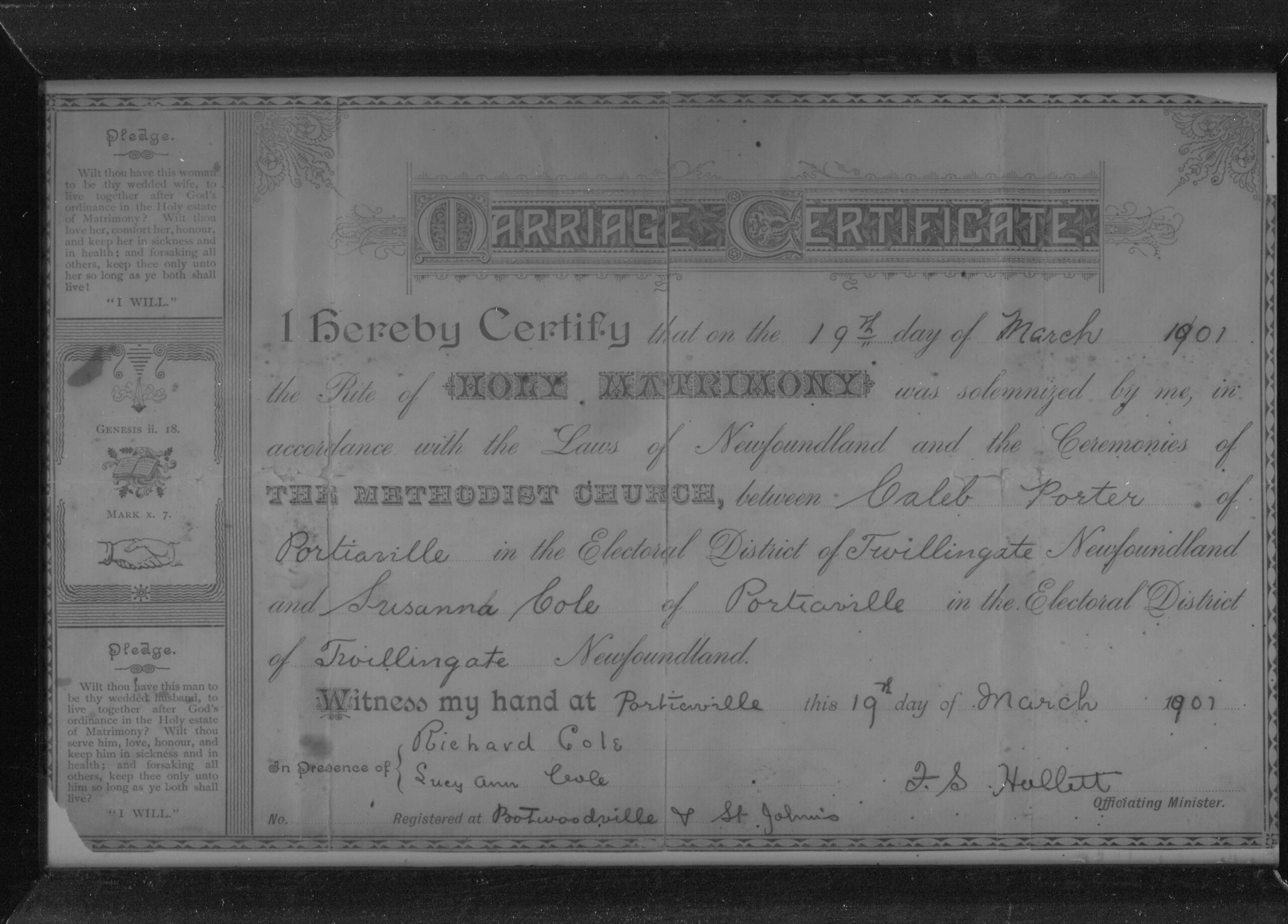 Here is a picture of my Great-Great-Grandfather Caleb Porter and his second wife Sarah Ball (the children depicted are theirs but I am unsure of their names). Caleb's first wife is my Great-Great- Grandmother Susannah Cole from Labrador. She died in 1903 of TB only three months after giving birth to my Great-Grandmother Susan Porter. Her family (the Cole's) lived in Porterville and Point of Bay. I am looking for a photo of her. If anyone has one, please email me at winsorshelley@hotmail.com   Submitted By: Shelley Winsor