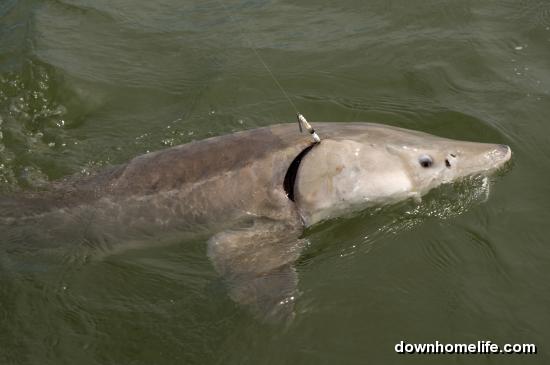 My friend Bryan and I were fishing in a walleye tournament on the south Saskatchewan River. Bryan thought he had hooked a piece of driftwood, however he soon realized that it was a sturgeon. It took us an hour to bring it alongside the boat. We estimated that it was six feet long and about 130 pounds. It was caught on a spinner using a 10 pound test line.